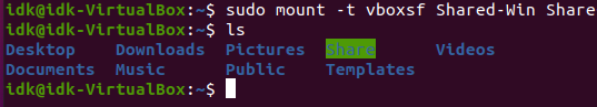 sudo mount -t vboxsf Shared-Win Share
