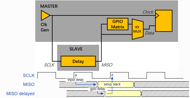 만약, Dummy bit을 사용하면 GPIO Matrix에서 40Mhz가 가능하나, Half duplex이고 no DMA입니다.