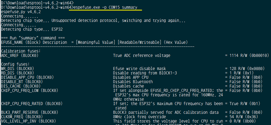 espefuse.exe -p COM15 summary