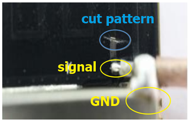 2. 안테나 Feed에서 가장 가깝게 Signal을 연결하고, GND를 연결합니다. (아래 그림에서 노란색)