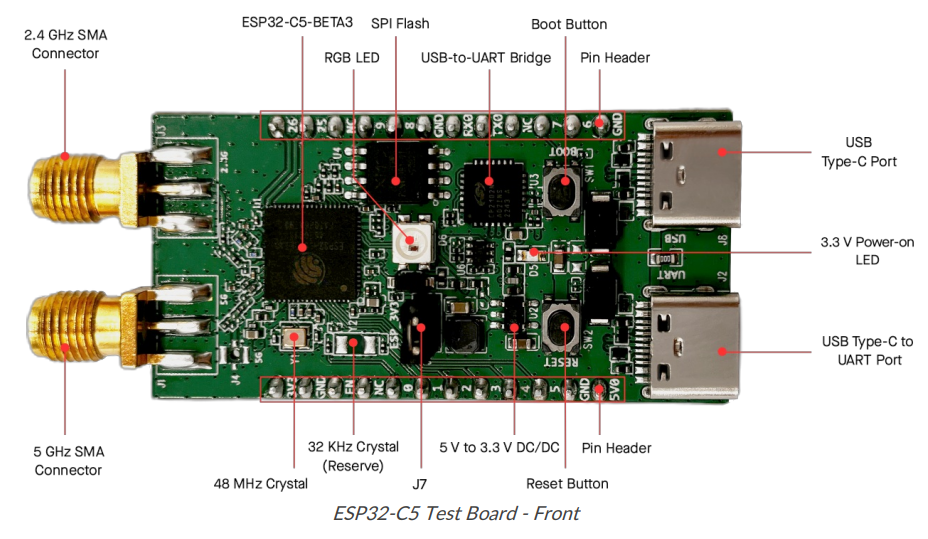 ESP32-C5 Test Board is an entry-level development board with a 4 MB SPI flash.