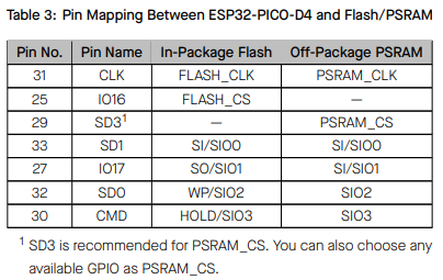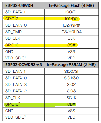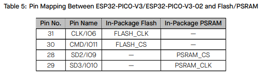 2) ESP32-D0WDR2-V3, ESP32-U4WDH의 경우 내부 점유된 아래 핀은 사용이 불가 합니다.