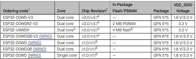 2. ESP32-D0WD-V3, ESP32-D0WDR2-V3, ESP32-U4WDH는 동일사양에 메모리 여부가 다릅니다.