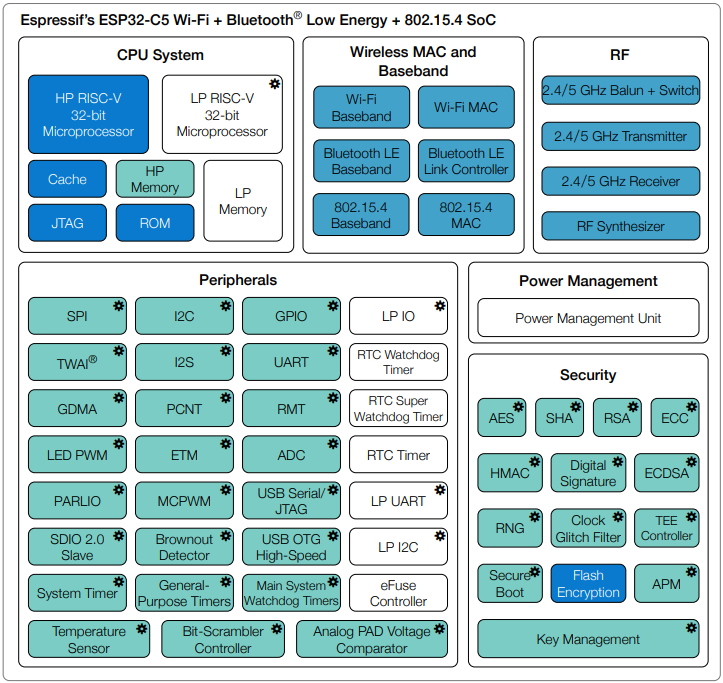 ESP32-C5는 Espressif Systems에서 개발한 고성능, 저전력의 IoT SoC(System-on-Chip)로, Wi-Fi 6, Bluetooth 5 (LE), IEEE 802.15.4 (Zigbee, Thread)를 지원하는 멀티프로토콜 IoT SoC 입니다.
