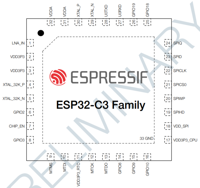 제품 사이즈 : 5x5mm QFN 32핀 (ESP8266EX와 핀맵 동일)