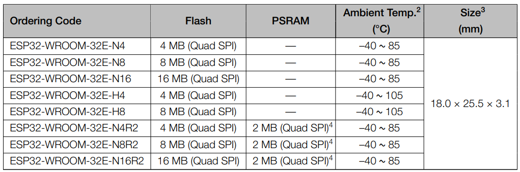 모듈 도명 (ESP32-WROOM-32E와 32UE는 pin to pin 호환 가능)