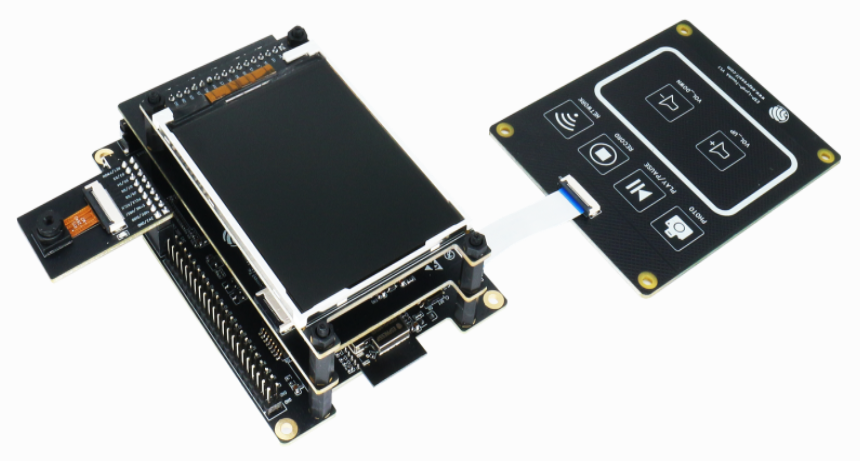 개발 보드의 구성을 살펴 보면, LCD, 오디오, 터치패드, 카메라가 장착되어 있고, IO포트가 확장되어 있습니다.