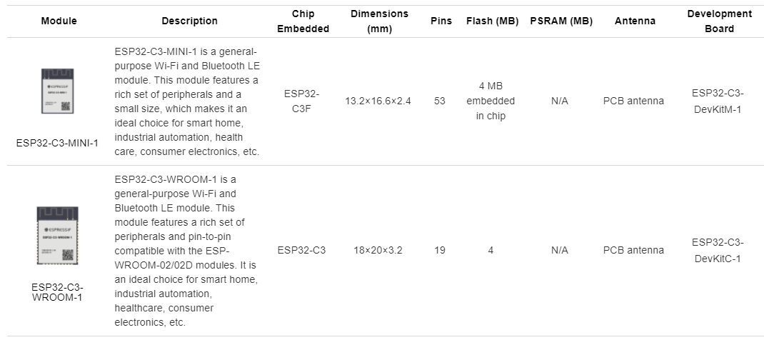 ESP32-C3 기반의 2개의 모듈이 출시가 예정되어 있습니다.