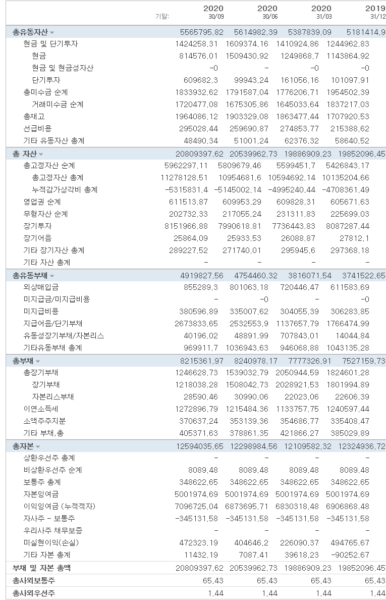 총유동자산이 5565785이고 총 유동부채가 4919827 이므로(유동자산이 유동부채보다 큼), 유동성 부족에 대한 리스크가 적다고 할수 있다. 자본에 비하여 부채가 적으므로 매우 우량하다고 볼수 있다. 다만, 현금을 너무 사내에 쌓고 있는게 아닌지, 미래 성장을 위한 투자가 너무 적은지는 다른 문제이다.