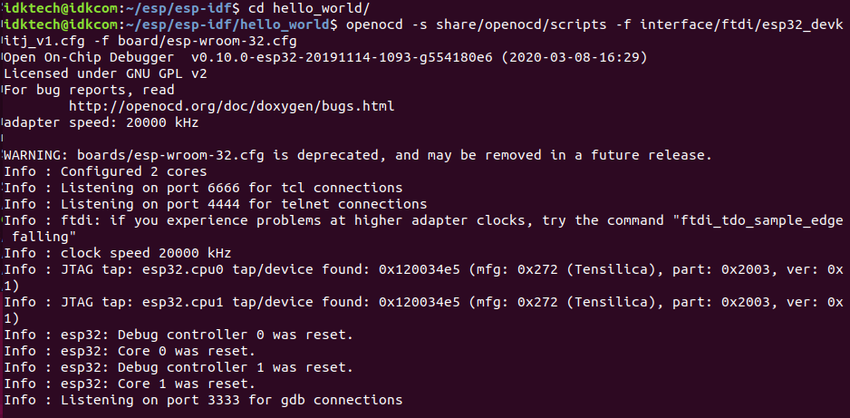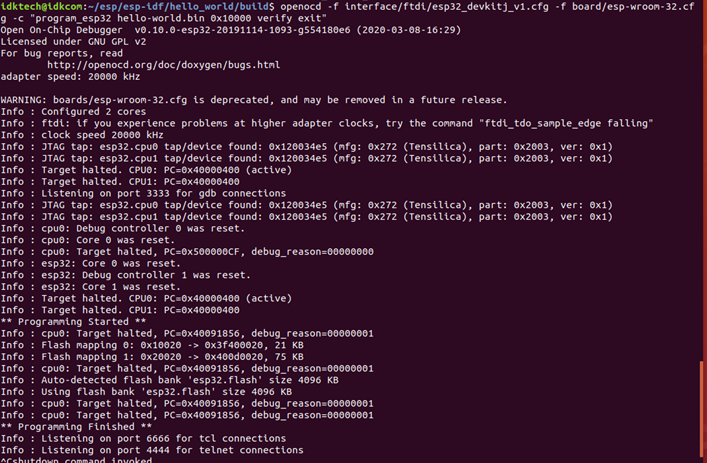 openocd -f interface/ftdi/esp32_devkitj_v1.cfg -f board/esp-wroom-32.cfg -c "program_esp32 hello-world.bin 0x10000 verify exit"