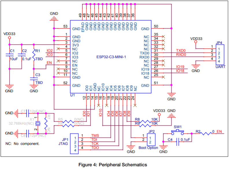 • ESP32-C3FH4 or ESP32-C3FN4 embedded, 32- bit RISC-V single-core processor, up to 160 MHz