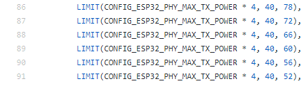 아래 header파일에서 Target power limit를 수정해 주면 됩니다. (ESP32, Master branch 기준)
