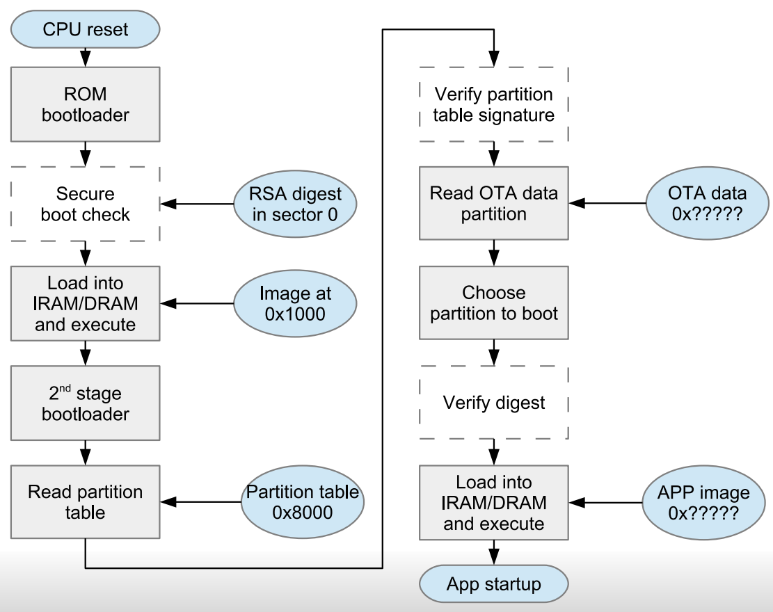 - Partition table을 read하고, 해당 APP image로 부팅을 해줍니다. (IRAM/DRAM에 load하고 실행)