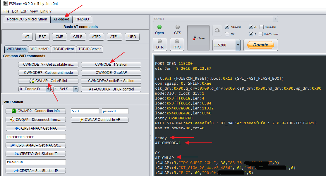 ready이후 아래 3개 명령을 입력하여, WiFi Scan을 해볼수 있습니다.
