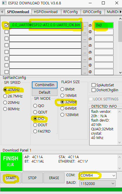 - ESP Download tool에서 아래와 같이 다운로드 합니다.