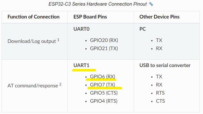 ESP32-C3-MINI-1 의 경우 UART1을 AT command 통신 포트로 사용하며, GPIO6, GPIO7을 기본으로 사용합니다.