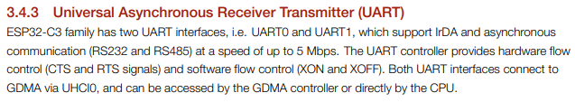 ESP32-C3는 2개의 UART를 지원합니다. 아래는 ESP32-C3의 UART에 대한 설명입니다.