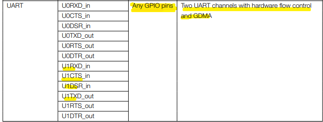 UART는 핀이 고정된게 아니고, Any GPIO로 firmware에서 할당하여 사용 하면 됩니다.