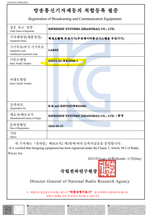 ESP32-S3-WROOM-1의 KC인증이 완료 되었습니다.